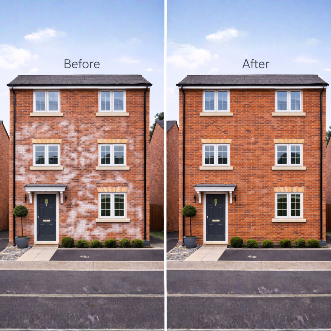 Efflorescence is the white, powdery, salt deposit that appears on brick work, particularly on new-build homes. It can make a newly built home look patchy, stained and poorly finished.