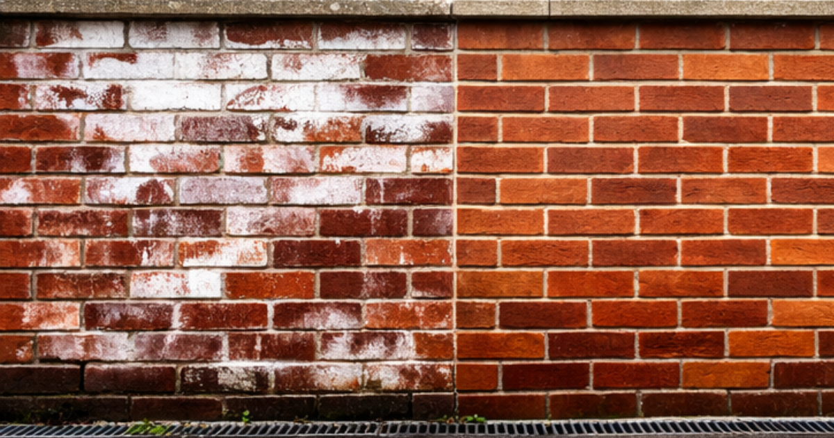 Efflorescence is the white, powdery deposit that appears on brickwork when natural salts inside the brick or mortar dissolve in water and migrate to the surface. When the water evaporates, the salts are left behind as a visible white bloom. It’s a chemical reaction, not mould, not dirt, and not usually a defect.
